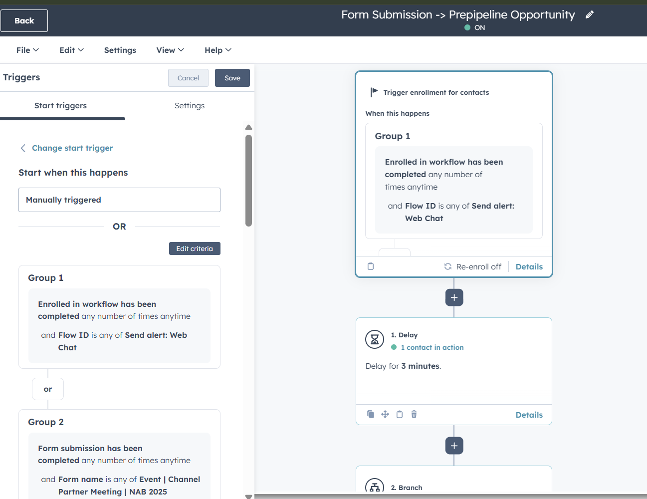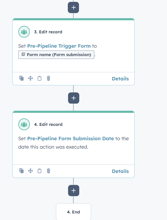 For instance, we’re tracking form submissions as one of the triggers. Then, once that trigger happens, the workflow runs the next action, creating an Opportunity in what we’ve been calling “pre-pipeline.”