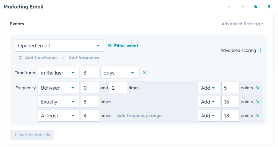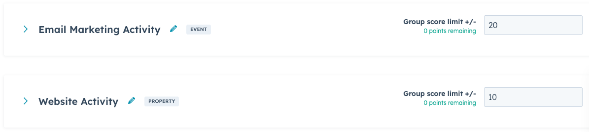 Score categories and ceilings: In HubSpot, you can group score criteria into categories. For example, you could create categories for email marketing, website traffic, events and webinars. Within these categories you can set a maximum score. This prevents a contact from over-indexing on one single action. For example, if a contact opened an email 50 times, it wouldn’t add 5 points for each open, it would stop counting after just a few. That way someone’s score does not jump up to 250 from email interactions alone, which may or may not be that indicative of lead quality.