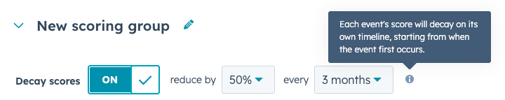 Score Decays: For engagement or combined score event groups, you can turn on score decay, which automatically reduces an individual event's score based on how long ago a scored event occurred. Score decay is independent to each event, follows linear logic, and decayed scores aggregate to the overall score value.